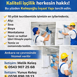 Kaliteli işçilik, titizlik ve güvenin buluşma noktası.” Her iş benim için sadece bir görev değil, aynı zamanda bir sanat ve müşteri memnuniyetini garanti eden bir söz. Alçı, sıva, montalama ve boya işlerimde her detay özenle planlanır; doğru malzeme, doğru teknik ve ustalıkla birleşir. Sizi diğerlerinden ayıran farkım, sadece işi yapmak değil, işin sonunda size uzun süreli memnuniyet ve estetik bir sonuç bırakmaktır. Profesyonel yaklaşımım, titiz çalışma disiplinim ve yılların verdiği deneyim ile her projeyi kusursuz tamamlarım. Müşterilerimle kurduğum güven ilişkisi ve işin her aşamasına gösterdiğim özen, beni diğerlerinden farklı kılar. Sizin hakkınız olan kaliteli hizmeti, zamanında ve sorunsuz bir şekilde sunmak benim en büyük önceliğimdir.