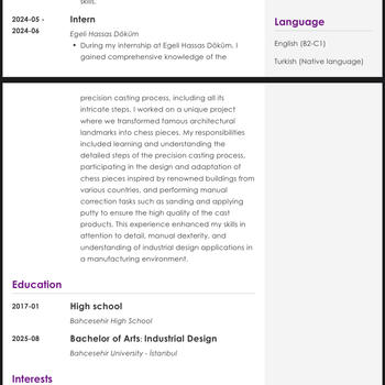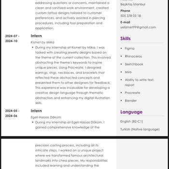 Psikoloji mezunu ve İnsan Kaynakları & Talent Acquisition alanında deneyimli bir danışman olarak, CV’nizi sadece “dolu” değil, doğru anlatan ve öne çıkaran bir hale getiriyorum. Başvurduğunuz pozisyonun beklentilerine göre CV’nizi yeniden yapılandırıyor, güçlü yönlerinizi net ve profesyonel bir dille ifade etmenize yardımcı oluyorum. ATS uyumlu, sade ve etkili CV’ler hazırlayarak işe alım uzmanlarının dikkatini çekmenizi hedefliyorum. Yeni mezun, kariyer değişikliği yapmak isteyen ya da CV’sini güncellemek isteyen herkes için kişiye özel çözümler sunuyorum. Amacım; sizi en doğru şekilde temsil eden, özgüvenle göndereceğiniz bir CV oluşturmak. Dipnot: CV örnektir, kişinin izni alınmıştır.