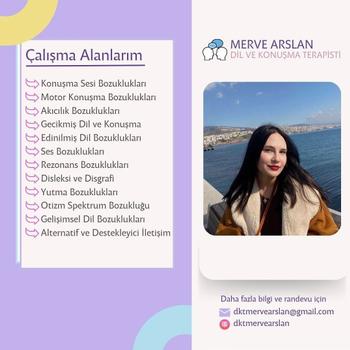 Herkese Merhaba Ben Dil ve Konuşma Terapisti Merve Arslan. Kapadokya Üniversitesi Dil ve Konuşma Terapisi lisans bölümünden mezun oldum. Eğitim sürecim boyunca çeşitli özel eğitim ve rehabilitasyon merkezlerinde, eğitim ve araştırma hastanesinde, Kapadokya Üniversitesi Dil ve Konuşma Terapisi Uygulama ve Araştırma Merkezinde uygulamalı gözlem ve staj çalışmalarında bulundum. Lise yıllarımdan itibaren ilgi alanımda olan iletişim ve konuşma problemleriyle ilgilenmekteyim. Çeşitli kongrelere ve eğitimlere katılarak alandaki gelişmeleri yakından takip etmekteyim. Ayrıca sosyal platformlarda dil ve konuşma alanında uzman terapistlerin çalışmalarını ve bu alandaki gelişmeleri yakından takip edip, bu sürecin mesleğimdeki bilgi ve beceri birikimimi sürekli olarak güncel tutmama olanak sağlayacağına inanmaktayım.