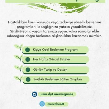 Merhaba, ben Uzman Diyetisyen Merve Güneş. Sağlıklı beslenmeyi öğrenerek aç kalmadan kalıcı ve doğru bir şekilde kilo vermek için ihtiyacınız olan şey popüler ve zor diyetlerden uzak size özel hazırlanmış beslenme programıdır. Kilo verme, kilo alma, pcos, insülin direnci, gebelik dönemi, emziklilik, diyabet, tansiyon, kolesterol, kalp hastalıkları, bağırsak ve mide hastalıkları gibi birçok rahatsızlığa özel beslenme programı uygulayarak yaşam kalitenizi yükseltmeniz mümkün.
