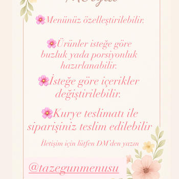 Kadın emeğiyle sofralara değer katıyoruz El emeğiyle hazırladığımız özel sofralar, ikramlıklar ve davet menüleriylekurumlar ve özel etkinliklerde toplu ikram ve sofra organizasyonları hazırlıyoruz. İnstagram adresimiz tazegunmenusu “Kadın emeğiyle kurulan sofralar, en samimi bağların kurulduğu yerlerdir.” (Zeytinyağlı,Salata,Hamur işleri, Tatlılar ve daha fazlası) Kişi sayısı ve istenilen miktara göre hazırlanır. İstanbul Avrupa yakası