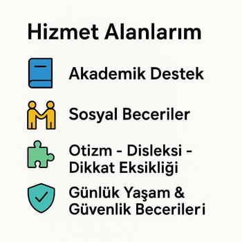 ALAN MEZUNU ÖZEL EĞİTİM ÖĞRETMENİNDEN PROFESYONEL BİREBİR DERS Ben Özel Eğitim Öğretmenliği lisans mezunu bir öğretmenim. Öğrencilerime bilimsel yöntemlerle, bireyselleştirilmiş ders programları hazırlıyorum. DESTEK ALANLARIM Öğrenme Güçlüğü Disleksi, Diskalkuli vb. Dikkat Eksikliği ve Hiperaktivite Otizm Spektrum Bozukluğu Dil ve Konuşma Gelişimi Akademik Destek Sosyal Beceriler Günlük Yaşam Becerileri öz bakım, yemek yeme, giyinme vb. Güvenlik Becerileri NEDEN BEN? Çocuk gelişimi değil, ÖZEL EĞİTİM ALAN MEZUNUYUM. MEB ve üniversite onaylı birçok eğitim ve seminere katıldım WISCR, PECS, İşaret Dili vb Aile ile düzenli iletişim, bireysel planlama ve şeffaf süreç yönetimi sağlıyorum. DERS SEÇENEKLERİ Dersler evinizde veya online olarak yapılabilir. Amacım, öğrencinin yalnızca akademik değil; sosyal, günlük yaşam ve güvenlik becerilerinde de bağımsızlığını artırmak.