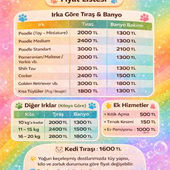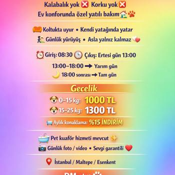 Evde Köpek Pansiyonu / Kuaför – İstanbul Maltepe Sertifikalı,Veteriner teknikeri olarak bilinçli güvenli, hijyenik bir ortamda patili dostlarınızı evimde ağırlıyorum. Konaklama, gündüz bakım, banyo, tıraş ve daha fazlası. Günlük video ve resimlerle patilerinizi gorebileceksiniz,onlarla TV izleyen,gün boyu yanlarında olan ,sohbet eden onlarin oynatan bir ablaları olacak.Uyku vaktinde bile sahipleriyle uyuyuyan canlar müjde ablalariyla uyuyabilecek... Kafes yok ,yalnız kalmak yok Müjde ablaları var! #Gecelik:800 TL ( 1-15 kg) #Kreş:(10 saat :500 TL) #2hafta ve üzeri kalimlarda %50 indirimli Banyo ve hijyen traşı #1 aylık ve üzeri kalimlarda indirimli fiyat tarifesi uygulanır.(%15) İnstigram adresi @mujdem.pansiyonkuafor adresimden ulaşabilirsiniz.
