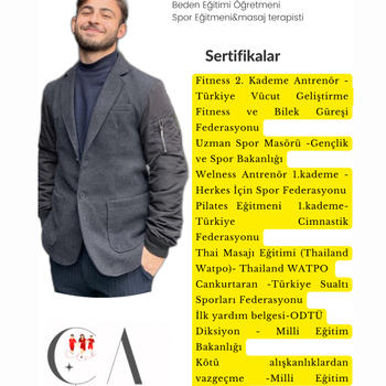Beden Eğitimi Öğretmeniyim. Fitness 2. Kademe antrenörlük belgesine sahibim. Aynı zamanda Masaj Terapisti,Plates Antrenörü,Welness antrenörü belgelerine sahibim. Siz değerli danışanlarıma hizmet etmekten memnunluk duyarım.