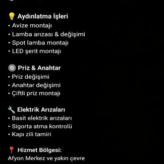 Avize montajı Basit elektrik arızaları Led döşeme Trafo takma Anahtar priz montajı Televizyon montajı Sigorta değişimi Hızlı, uygun ve temiz iş
