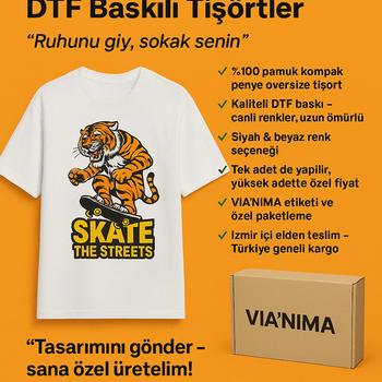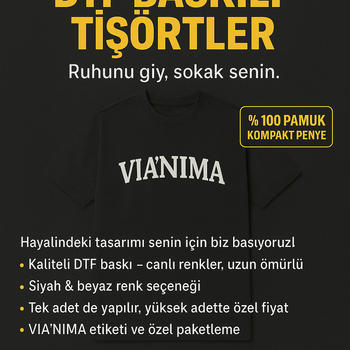 Hayalindeki tasarımı %100 pamuk, oversize tişörtler üzerine senin için biz basıyoruz! Kaliteli DTF baskı tekniğimiz ile canlı renkler, uzun ömürlü kullanım. Kompakt penye kumaş – yumuşak ve dayanıklı Siyah ve beyaz renk seçenekleri Tek adet sipariş de alınır VIA'NIMA etiketi ve özel kutulu teslimat İzmir içi elden teslim / Türkiye geneli kargo