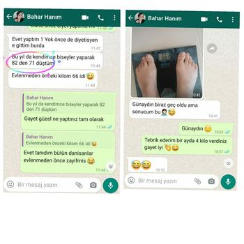 Size özel, kolayca ulaşabileceğiniz besinlerle, herhangi bir kısıtlama olmadan, ideal kilonuza ulaşmak oldukça basit. Diyetlerimiz hafta liste olacak yani haftalık diyetler değişecek. WhatsApp 'tan istediğiniz zaman görüşme mevcuttur. Ayda ortalama - kg yağdan kayıp sağlamaktayız. Herhangi bir kronik rahatsızlığınız olması durumunda tıbbi beslenme diyeti uygulanacaktır. Hazırsanız hadi başlayalım. Online diyette mutlu kilolarına kavuşan danışanlarımız arasına katılmanızdan mutluluk duyarız. İletişime geçmek için dahili ve WhatsApp numaram . Attığınız her adım değerli.
