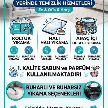 Merhaba, evinizdeki konforun ve sagliginizin ne kadar degerli oldugunu biliyoruz. ÇİÇEK YERİNDE TEMİZLİK olarak, hali, koltuk ve kanepelerinizi sadece yuzeysel degil, derinlemesine temizliyoruz. Vakumlu Yikama: En derinlerdeki toz ve akarlari temizleyen yuksek cekim gucune sahip makineler kullaniyoruz. Bitkisel Sampuanlar: Aileniz ve evcil dostlariniz icin guvenli, sagliga zararsiz ozel solusyonlar tercih ediyoruz. Leke Kontrolu: Zorlu lekeler uzerinde uzmanlasmis ekipmanlarimizla esyalarinizi ilk gunku formuna kavusturuyoruz. Isimize olan guvenimizle, memnuniyet garantisi veriyoruz. Randevu ve detayli bilgi icin bize mesaj atabilirsiniz. Simdiden temiz gunlerde kullanin!