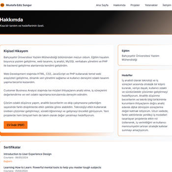 Yazılım mühendisliği eğitimim ve deneyimlerim sayesinde hem frontend hem de backend süreçlerinde etkin bir şekilde çalışıyorum. HTML, CSS, JavaScript ve modern frameworklerle kullanıcı deneyimi yüksek, hızlı ve güvenli web çözümleri geliştiriyorum. Farkımı yaratan şey, projeye sadece teknik açıdan değil; tasarım, kullanılabilirlik ve iş hedefleri açısından da yaklaşmam.