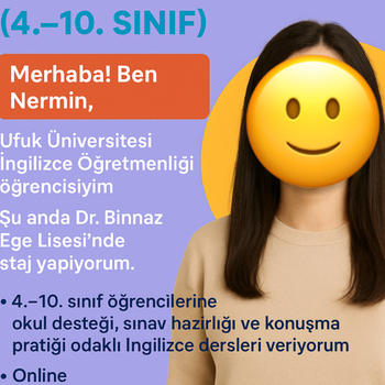 Merhaba! Ben Nermin Yeter, Ufuk Üniversitesi İngilizce Öğretmenliği son sınıf öğrencisiyim. Şu anda Dr. Binnaz Ege Lisesi’nde staj yapmaktayım.Okuma, yazma, dinleme ve konuşma becerilerinin geliştirilmesi.Okul derslerine destek sınavlara hazırlık kelime ve grammer bilgisini geliştirmek üzerine derslerimi ilerletmekteyim,öğrencinin seviyesine uygun sıfırdan başlamaktan korkmamaları için elimden gelen motivasyonu sağlamak için buradayım