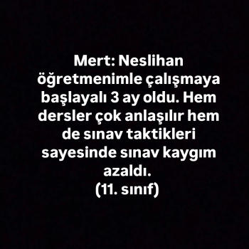 Merhaba Bir senelik deneyime sahip Türk Dili ve Edebiyatı öğretmeniyim. Bursa’da hem yüz yüze hem de çevrimiçi özel dersler veriyorum. Öğrencinin seviyesine göre başlangıçtan ileri aşamaya kademeli, etkili ve sistemli bir programla ilerliyorum.