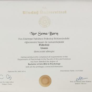 Merhaba, ben psikolog Nur Sema Barış. Psikoloji lisans eğitimimi Uludağ Üniversitesinde tamamladım. Lisans eğitimimin ardından Aile Danışmanlığı, Bilişsel Davranışçı Terapi, Kısa Süreli Çözüm Odaklı Terapi gibi çeşitli eğitimler alarak yetişkin danışanlar ile çalışmaya başladım. Bunun yanında 4 yıl özel bir huzurevinde yaşlı bireyler ve ailelerine hizmet verdim ve ağırlıklı olarak Demans gibi geriatrik rahatsızlıklar ile çalıştım. Danışmanlık sürecinde gizlilik ilkesi ve etik kurallar çerçevesinde bireylerin kendi yaşam sorunlarına ilişkin iç görü kazanmalarını ve değişime giden yolda bireylere rehberlik etmeyi amaçlamaktayım.