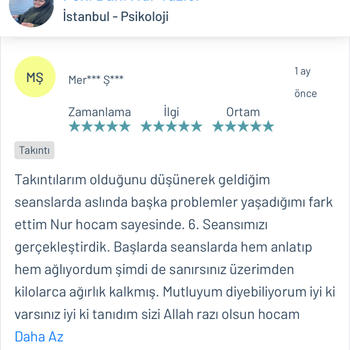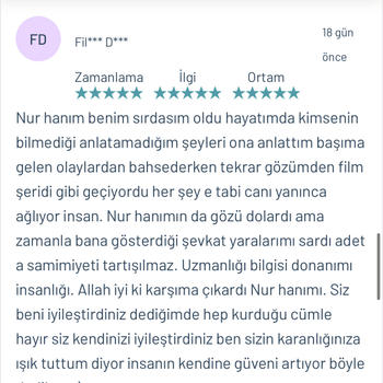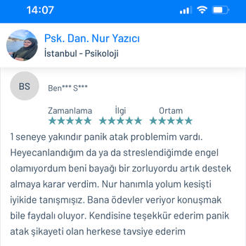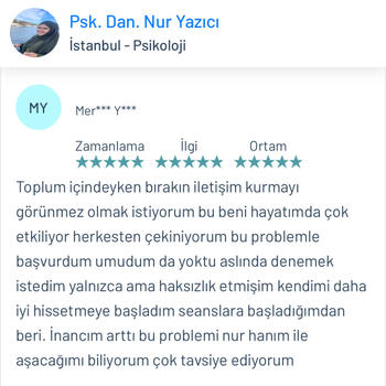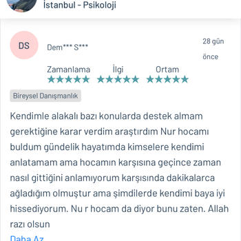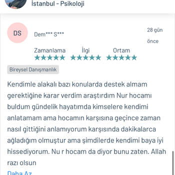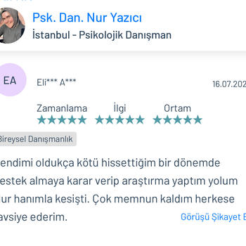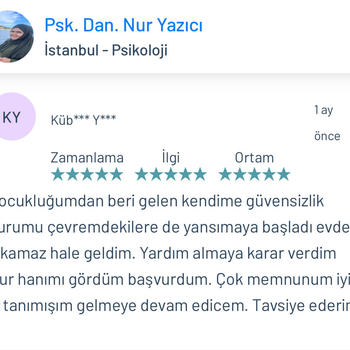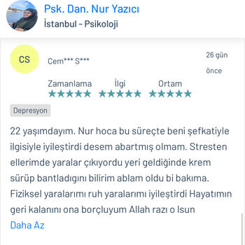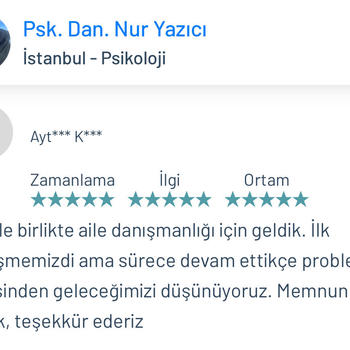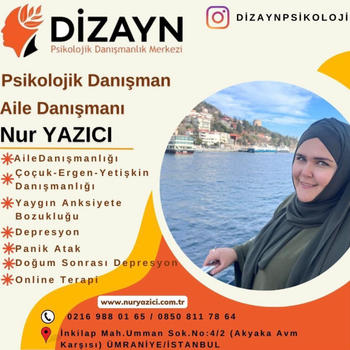 Psk. Dan. Nur YAZICI lisans eğitimini Ankara Ufuk Üniversitesi Rehberlik ve Psikolojik Danışmanlık ( PDR ) bölümünde tamamlamıştır. Üniversite eğitimi boyunca birçok seminer ve eğitimlere katılmış olup alanı yakından takip etmiştir. Alanla alakalı eğitimleri yakından takip etmenin yanı sıra adliye, özel eğitim kurumları, rehberlik araştırma merkezi, kreşler, lise, ortaokul ve ilkokullar olmak üzere birçok kurumda da staj yapmıştır. Lisans eğitimi bittikten sonra istanbul üniversitesinde okul öncesi çocuk gelişimi ve eğitimi, Dumlupınar üniversitesinde oyun terapisi, Aile danışmanlığı gibi birçok eğitime katılıp sertifika almaya hak kazanmıştır. Bunların yanında İstanbul Üniversitesinde çocuk gelişimi bölümü okumaktadır. Bu zamana kadar online ve yüzyüze olarak birçok danışanla çalışmıştır. Şu anda kurucusu olduğu Dizayn psikolojik danışmanlık merkezinde danışan görmeye devam etmektedir. Çalışma alanları Aile terapisi Evlilik öncesi çift terapisi İlişki Problemleri Takıntılar Anksiyete bozuklukları Kayıp-Yas terapisi Öfke Nöbetleri Bilişsel Davranışçı Terapi (BDT) Kısa Süreli Çözüm Odaklı Terapi Kaygı problemleri Evlilik korkusu Çocuk ve ergen psikolojisi Yetişkin-yaşlı psikolojisi Depresyon Yaygın anksiyete bozukluğu Aile içi iletişim sorunları Agorafobi Özgül fobi Sosyal fobi Panik Atak Lohusa sendromu Sınav kaygısı Özgüven sorunu Travma sonrası stres bozukluğu Obsesif kompulsif bozukluk ( OKB ) Dikkat eksikliği