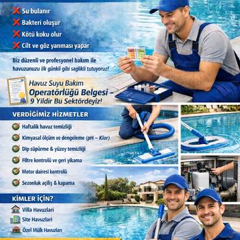 9 yıllık sektör tecrübemle havuz bakım ve su yönetimi alanında profesyonel hizmet sunuyorum. Periyodik havuz bakımı, su kimyası dengesi, klorlama, pH kontrolü, filtrasyon sistemleri takibi ve ekipman kontrolleri konusunda uzmanım. Milli Eğitim Bakanlığı onaylı ve e-Devlet üzerinden doğrulanabilir Havuz Suyu Bakım Belgesi’ne sahibim. Amacım; sağlıklı, hijyenik, berrak ve standartlara uygun havuzlar oluşturmak, düzenli bakım ile oluşabilecek sorunları önceden tespit ederek kalıcı çözümler sunmaktır. Profesyonellik, güven ve sürdürülebilir kalite önceliğimdir.