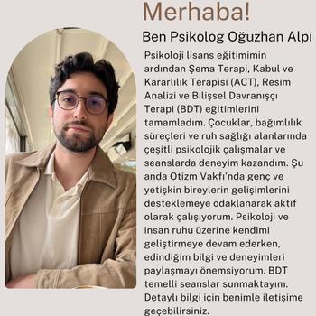 Merhaba! Ben Psikolog Oğuzhan Alpı Psikoloji lisans eğitimimin ardından Şema Terapi, Kabul ve Kararlılık Terapisi (ACT), Resim Analizi ve Bilişsel Davranışçı Terapi (BDT) eğitimlerini tamamladım. Stajımı Ankara Eğitim ve Araştırma Hastanesine bağlı olan Çocuk Polikliniği, AMATEM ve TRSM’de; Çocuklar, bağımlılık süreçleri ve ruh sağlığı alanlarında çeşitli psikolojik çalışmalar ve seanslarda deneyim kazandım. Şu anda Otizm Vakfı'nda genç ve yetişkin bireylerin gelişimlerini desteklemeye odaklanarak aktif bir şekilde çalışıyorum. Psikoloji ve insan ruhu üzerine kendimi geliştirmeye devam ederken, edindiğim bilgi ve deneyimleri paylaşmayı önemsiyorum. BDT temelli seanslar sunmaktayım. Detaylı bilgi için benimle iletişime geçebilirsiniz.