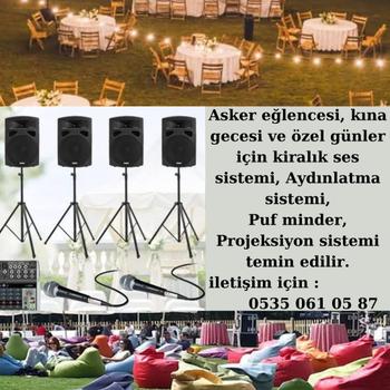Asker eğlences,kına gecesi ve özel günler için kiralık ses sistem, aydınlatma sistemi, puf minderi projeksiyon sistemi kiralanır.