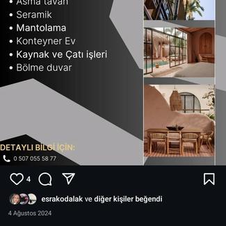 Meslek de 15 yıldır büyük bir özveri ile işimizi yapmaktayız.Alçı boya işler gizli ışık spot bant karolam tavan seramik çatı kaynak prefabrik ev isteğe göre yapılmaktadır detaylı bilgi ve görüş için siz değerli müşterilerimizi bekliyoruz.