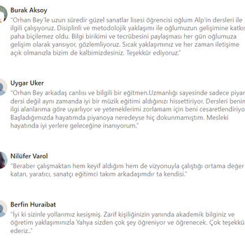 Merhaba, ben Orhan. Besteci, piyano ve gitar icrası, ayrıca müzik eğitmeniyim. Aktif olarak İTÜ MİAM'da müzikal kompozisyon alanında yüksek lisans çalışmalarıma devam etmekteyim, lisans eğitimimi ise İstanbul Üniversitesi Devlet Konservatuvarı'nda aldım. 2019'dan beri özel ders vermekteyim, öğrencilerimin yaş aralığı 9'dan 30'lu yaşlara kadar değişmekte. Kurumsal olarak part-time ve full-time eğitmenlik tecrübem de mevcuttur. Dolayısıyla, öğrenciyi merkeze alarak fakat öğretmem gerekenlerden taviz vermeden, en etkili ve eğlenceli yöntemler ile öğretmekteyim. Ders planlaması ve gelişim takibi önceliklerim arasında yer almakta. Gitar, piyano ve müzik teorisinde ileri seviyelere kadar öğrenci almaktayım, konservatuvar sınavlarına hazırlık dahildir. Öğrencilerimin yorumlarına LinkedIn hesabımdan ulaşabilirsiniz. Görüşmek üzere!