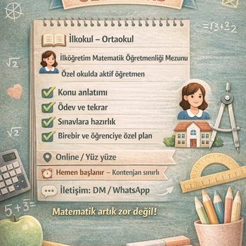 Matematikte zorlanan değil, başaran öğrenciler yetiştiriyorum! İlkokul ve ortaokul düzeyinde, öğrencinin seviyesine göre birebir matematik özel ders veriyorum. İlköğretim Matematik Öğretmenliği mezunuyum ve özel okulda aktif olarak öğretmenlik yapıyorum. Ezbere değil, mantığını kavratarak öğrenme Konu anlatımı + bol örnek + düzenli tekrar Ödev takibi ve sınavlara bilinçli hazırlık Öğrenciye özel ders planı