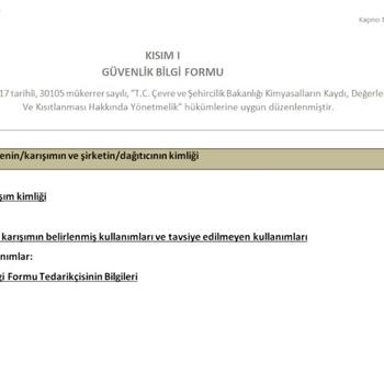 Güvenlik Bilgi Formu Hazırlığı Ürünü oluşturan reçeteyi ve hammadde Güvenlik Bilgi formlarını göndermeniz gerekmektedir. Reçetenin içindeki hammaddeler ve oranlar 3. Şahıslarla paylasilmamaktadir.