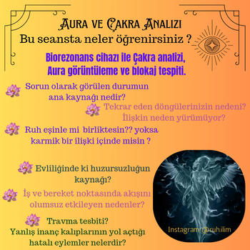 Özlem Karaca Spritüel yaşam koçu,manevi danışmanlık,rehberlik bioenerji uzmanlığı ve bilinçaltı mikrofrekans şifalandırma uzmanı Online danışmanlık seanslarımızda neler öğrenirsiniz ? Biorezonans cihazı ile Çakra analizi, Aura görüntüleme ve bilinçaltı blokaj tespiti. Sorun olarak görülen durumun ana kaynağı nedir? Tekrar eden döngülerinizin nedeni? İlişkin neden yürümüyor? Ruh eşinle mi ? Birliktesin yoksa karmik bir ilişki içinde misin ? Evliliğinde ki huzursuzluğun kaynağı? İş ve bereket noktasında akışını olumsuz etkileyen nedenler? Travma tesbiti? Yanlış inanç kalıplarının yol açtığı hatalı eylemler nelerdir? -Hangi çakra blokajlı ? -Çakra ve letaif kanalları hangi frekansda çalışıyor? -Atasal ve aile karması var mı ? -Blokaja sebep olan yanlış düşünceler ve eylemlerin neler ? -Aura ve çakralar hangi enerjitik seviyede çalışıyor ? -Bilinçaltı kodları Görüşmeler WhatsApp görüntülü görüşme ile yapılmaktadır . Detaylı analiz değerlendirme ortalama 1 saat sürer