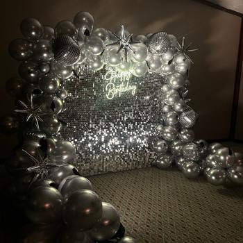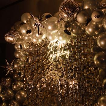 Doğum günü, bekarlığa veda, kutlama ve parti organizasyonlarında arka tag, balon, ışıklı yazı görselde gördüğünüz gibi arka plan oluşturularak kurulum gerçekleştirilir. Işıklı yazıda değişiklik yapılabilir.
