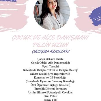 Merhabalar İstanbul gelişim üniversitesi çocuk gelişimi lisans mezunuyum. Ayrıca Aile danışmanı ve Oyun terapistiyim. Çocuk gelişim testleri zeka, dikkat testleri uygulayıcı sertifikasına sahibim. aktif olarak çocuk ve aile terapistliği yapmaktayım. Çalışma alanlarım: Çocuklarda Gelişim Takibi, Çocuk Odaklı Aile Danışmanlığı, Aile Terapisi, Çocuk Zeka Testleri, Konuşma ve Dil Bozuklukları, Bebeklerde Gelişim Takibi ve Gelişim Desteği, Çocuklarda Dikkat Eksikliği ve Hiperaktivite Bozukluğu, Özel Öğrenme Güçlüğü (Disleksi), Okul fobisi, Özgüven problemleri (Özgüven Ekikliği, Aşırı Özgüven) , Sosyal Fobi, Davranış Bozukluğu, Obsesif Kompulsif Bozukluk (Takıntılar ve Tekrarlar), Üstün Zihinsel Potansiyelli Çocuklar ,Ergenlik Dönemi Ruhsal Sorunları
