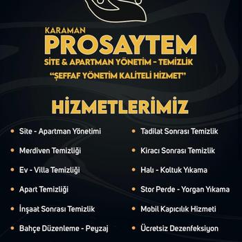KARAMAN PROSAYTEM OLARAK GÜVENİLİR VE UZMAN EKİBİMİZLE TÜM KARAMAN VE ÇEVRESİNDE PROFOSYONEL TEMİZLİK HİZMETİ VERMEKTEYİZ. İLKEMİZ; MUTLAK MÜŞTERİ MEMNUNİYETİDİR. FAALİYET ALANLARIMIZ: APARTMAN,MERDİVEN,BİNA,EV, BÜRO TEMİZLİĞİ OLARAK HİZMET VERMEKTEYİZ. TÜM FAALİYETLERİMİZ SONRASINDA, ÜCRETSİZ DEZENFEKTE HİZMETİ SUNUYORUZ. PROSAYTEM TEMİZLİK ŞİRKETİ ''Yaşam Alanlarınızı Temizliyoruz''