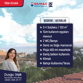 Bodrum yarımadası ve çevresinde gayrimenkul almak, satmak ve kiralamak istiyorsanız kurumsal Re/Max firmasıyla, işinde profesyonel 25 gayrimenkul danışmanı meslektaşlarımla beraber siz değerli müşterilerimize hizmet vermekteyim. Duygu Erişik Gayrimenkul Danışmanı Re/Max Pasha Bodrum