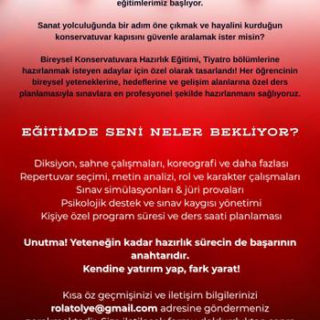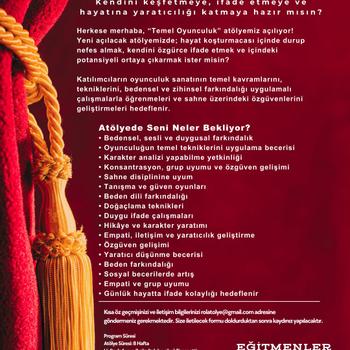 YENİ DÖNEM OYUNCULUK EĞİTİMLERİMİZ BAŞLIYOR! - Bireysel Konservatuvar Hazırlık Eğitimi - Çocuklar için Yaratıcı Drama Atölyesi - Yetişkinler için Temel Oyunculuk Atölyesi Eğitmenler: - İlber Gürtunca - Serhan Toksoy