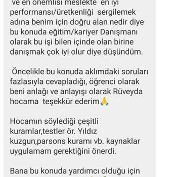 içsel yolculugunuzda güvenli destekleyici ortam sunarak zorluklarla baş etme becerilerinizi geliştirmenize ve potansıyellerınızı ortaya çıkarmanıza eşlik ediyorum Hangi mesleği seçmeliyim Gelecekte beni mutlu edecek alan ne Nasıl daha verimli çalışabilirim Eğer bu sorular aklını kurcalıyorsa yalnız değilsin Kariyer danışmanı olarak ilgi ve yeteneklerini kesfetmene hedeflerini netleştırmene ve sana en uygun yol haritasını olusturmana yardımcı oluyorum Sınav sürecinde kaygıyı azaltıp motivasyonunu artırarak geleceğine güvenle adım atmanı destekliyorum Unutma doğru seçim seni hayallerine bir adım daha yaklaştırır