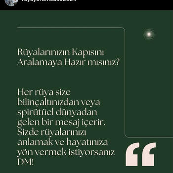 Profesyonel Rüya Yorumu ve Analizi Rüyalarınızın anlamlarını merak ediyor musunuz? Kişiye özel detaylı rüya analizi yapıyorum. Spiritüel, psikolojik ve sembolik yorumlarla size rehberlik ediyorum. Hemen rüyanızı paylaşın, anlamını öğrenin!