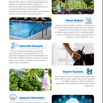 Bahçe peyzaj bakımı, Havuz bakımı, Güvenlik ve Danışma, Haşere İlaçlama, Apsiyon Hizmetleri, Avukatlık Hizmetleri, Aidat Takip Sistemi, Satın Alma- Muhasebe Finans, Asansör Bakımı, Temizlik Hizmetleri ile yaşam alanlarınız için profesyonel çözümler ile yanınızdayız.