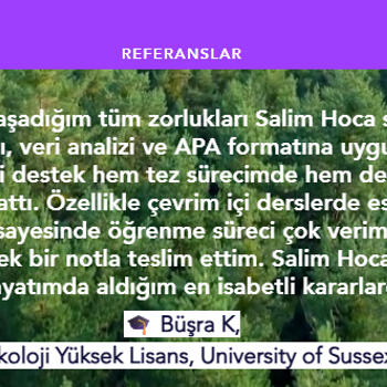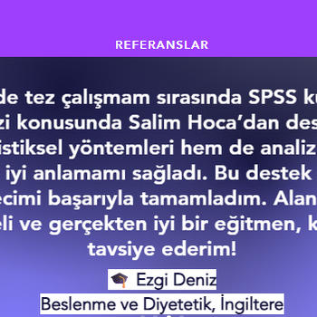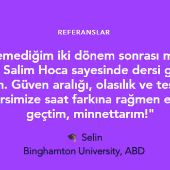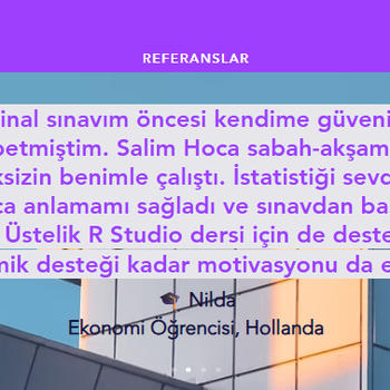Merhaba istatistik ve veri analizi alanında on yılı aşkın deneyime sahibim. Yurt içi ve yurt dışında lisans ve yüksek lisans öğrencilerine istatistik dersleri verdim. Derslerimde konuları anlaşılır ve adım adım anlatarak ödev ve projelerde uygulamalı destek sağlıyorum.