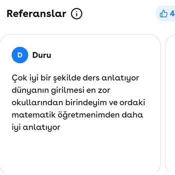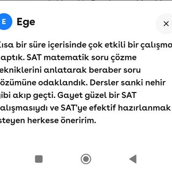 Merhabalar, halihazırda IB programlı liselerde. ya da yurtdışı liselerden öğrencilerimle online derslerimizi sürdürmekteyiz. Ara sınıflarda okula destek müfredat paralelinde İngilizce-matematik derslerim ve 11-12. sınıflarda Digital SAT sınavına hazırlık derslerim ya da ülke- üniversite özelinde Ompt D (Hollanda) Tolc (İtalya) ve Çekya istediği benzeri sınavlar için İngilizce Matematik dersleri vermekteyim Mart 2024 Sat de öğrencilerim Matematik kısmından 800 uzerinden , 610-660-680-680-700-740-800 puan aldılar Kısa sürede sıkı çalışma ve hızlı adımlarla ilerlemek isteyenlere bu yolda eşlik ediyorum Sizin de öğrencinize bu yolda eşlik etmek isterim. Aynı zamanda Ankara Üniversitesi Dil Tarih Coğrafya Fakültesinde Psikoloji lisansıma devam ediyorum sınavlara mental olarak da hazırlanmanıza yardımcı oluyorum. Son dört yıl içinde; dgs sınvlarında ; 2019 Türkiye 52. 2020 Türkiye 155. lik derecem bulunmakta Ales sayısal puanım 94 Türkiye 571. siyim Yök dil ingilizce puanım 92.5 dur. Başarıyı tesadüflere bırakmak istemeyen öğrenci ve velilere sınava hazırlık yolunda eşlik edebillirim. Referans olarak veli yorumları incelemenizi öneririm ya da görüşmek istediğiniz velim olursa bu imkanı da sağlayacağımı belirtmek isterim.