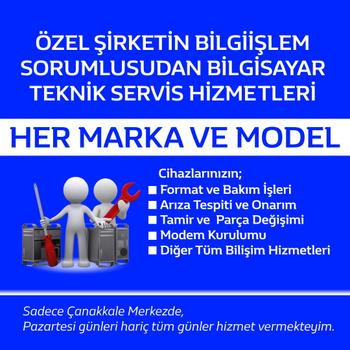 Özel bir şirkette bilgiişlem sorumlusu olarak çalışmaktayım. Çanakkale merkezde Pazartesi günleri hariç, ev ve işyerlerinizdeki masaüstü ve dizüstü bilgisayarlarınızın, Bakım & Onarımı – Format & SSD Upgrade İşlemleri – Arıza Tespiti & Tamiri – Modem Kurulum & İnternet Problemleri gibi tüm bilişim hizmetleri için lütfen iletişime geçiniz.
