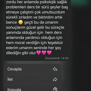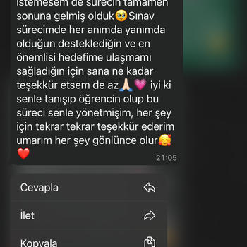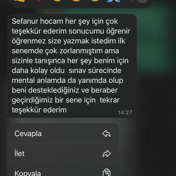 Merhaba ben Sefanur. Bundan iki yıl önce sınavda iyi bir başarı elde ederek Ankara’da tam burslu bir vakıf üniversitende hukuk fakültesini kazandım. Bir yılı Tuyun Akademi’de olmak üzere iki yıldır devamlı olarak koçluk yapıyorum. Bu zaman diliminde pek çok öğrencim, pek çok hayalimiz, pek çok hedefimiz oldu ve onları teker teker birlikte başardık. Eğer sen de bu yolda yalnız hissediyorsan, desteğe, sürekli senle ilgilenecek ve seni en doğru şekilde yönlendirerek programlar hazırlayıp seni takip edecek birine ihtiyaç duyuyorsan senin için yanında olacağım:) Hayallerine ulaşmandaki ilk adımın olacağım, ben hazırım sen de hazırsan kontenjanım dolmadan bir an önce başlayalım, hedefimiz bizi beklerr;)
