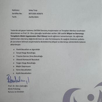 Merhaba, ben Ufuk Üniversitesi Psikoloji mezunu bir psikolog olarak travmalar, bireysel zorluklar, ilişki problemleri ve kaygı bozuklukları başta olmak üzere birçok konuda danışanlarımla çalışıyorum. Terapi sürecinde "İleri Seviye" eğitimlerini tamamladığım Kabul ve Adanmışlık Terapisi (ACT) ve Bilişsel Davranışçı Terapi (CBT) yaklaşımlarını temel alıyorum. Sadece online terapi üzerinden çalışıyorum ve ergenler ile yetişkinlere yönelik bireysel destek sunuyorum. Amacım; karşılaştığınız duygusal zorluklarda size anlayışla eşlik eden, yol gösteren ve süreç odaklı bir destek sunmak. Her bireyin iyileşme süreci kendine özgüdür. Eğer siz de kendi yolculuğunuzda güvenilir ve destekleyici bir uzmanla ilerlemek isterseniz, tanışmayı çok isterim. Hayatı kontrol etmeye çalışmak yerine, onunla anlamlı bir ilişki kurmayı seçmek sizin elinizde.