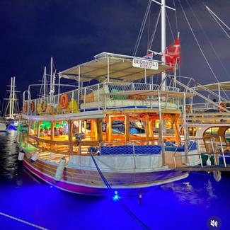 >Bodrum kumbahçe mevkinde halikarnas iskelesinde bağlı bulunmaktadır.teknemiz 54 kapasite olup yukarıda 35 tek kişilik güneşlenme yataklarımız ön tarafta 5 kişilik güneşlenme yatağı bulunmaktadır. 6 kişilik 10 adet oturma gruplarımız vardır. 2 adet bangaça (loca) oturma alanımız vardır