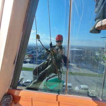 Bina içerisinden veya sepetli vinç gibi araçlarla ulaşılması zor alanlarin temizliği sağlanır. İple erişim tekniği ile daha hızlı ve ekonomik olarak hizmet vermekteyiz.