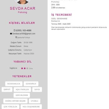YDÜ psikoloji bölümünden mezun oldum. YDÜ klinik psikoloji yüksek lisansımı tamamladım. Online olarak 2 yıldır aktif olarak danışan alıyorum. Bilişsel davranışçı terapi, travma , aile danışmanlığı, cinsel terapi, masal ve oyun terapisi eğitimlerimi aldım.