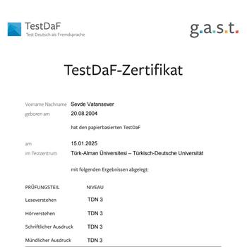 Türk-Alman Üniversitesi Hukuk Fakültesi'nde öğrenim görmekteyim. Okulumun sunduğu kaliteli hazırlık programını başarıyla tamamladım ve bu süreçte TestDaF sınavından B2 seviyesinde yeterlilik belgesi aldım. Hazırlık eğitimi sayesinde A1, A2 ve B1 seviyelerinde destek olabilecek kaynaklara ve yeterliliğe sahibim. Özellikle TestDaF formatını tercih edecek kişilere, kendi deneyimlerim doğrultusunda yardımcı olmaktan memnuniyet duyarım. Hafta içi ve hafta sonu, uygunluk durumuna göre her saatte çevrim içi (online) ve bulunduğum şehir dahilinde müsait kafe vs yerlerde ders verebilirim. Ders saatleri dışında da mesaj yoluyla yöneltilen sorulara yardımcı olmaktan mutluluk duyarım.