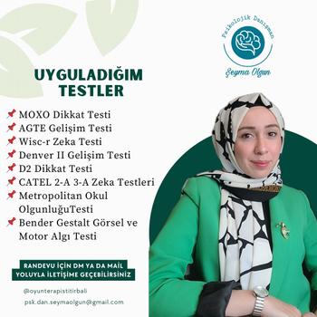 Danışmanlık sürecini desteklemek amacıyla çocuklar, ergenler ve yetişkinlere yönelik güvenilir ve geçerli psikolojik testler uyguluyorum. Bu testler, bireylerin bilişsel, duygusal ve davranışsal özelliklerini değerlendirmeye yardımcı olur. Detaylı bilgi için iletişime geçebilirsiniz.