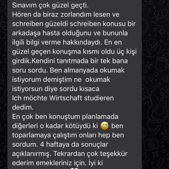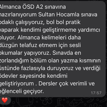 Mesleğini çok seven 13 yıllık Almanca öğretmeniyim. Almanya'da doğdum, büyüdüm, tüm eğitim hayatım orada geçti. Her yaş ve seviyeye uygun Almanca dersi veriyorum. Aile birleşimi, Goethe, TELC, ÖSD sınavlarına hazırlık dersleri veriyorum ve başarıyla geçen öğrencilerim var. Vakit kaybetmeyin, hemen başlayalım! Na dann, los! Hallo liebe Deutschlernende! Ich bin seit 13 Jahren begeisterte Deutschlehrerin und liebe meinen Job. Ich bin in Deutschland geboren, aufgewachsen und habe mein Abitur dort gemacht. Ich habe in Heidelberg studiert (eine fantastische Stadt, nicht wahr?). Ich unterrichte jung und alt, egal welches Niveau. Insbesondere Zertifikatsprüfungen wie TELC usw. sind mein Spezialgebiet. Alle meiner Schüler haben diese Prüfungen erfolgreich bestanden. Lass uns gleich beginnen, bin gespannt auf dich!