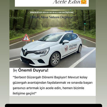İlk dersten itibaren kendini güvende hissedeceğin, sabırlı ve anlayışlı bir eğitim süreci sunuyorum. Amacım sadece ehliyet alman değil, trafikte gerçekten rahat olman. Ehliyet almak isteyenlere ehliyet, özel direksiyon almak isteyen kadınlara özel ders veriyorum.