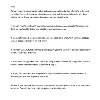 Merhaba, ben freelance içerik yazarlığı yapıyorum. Farklı alanlarda (blog yazısı, ürün açıklaması, tanıtım metni, sosyal medya içeriği vb.) özgün ve kaliteli içerikler üretiyorum. Yazılarım sade, anlaşılır ve ihtiyaca uygun şekilde hazırlanır. Teslim sürelerine sadığım, müşteri memnuniyetini ön planda tutarım. Profesyonel bir yaklaşımla çalışmak isterseniz, sizin için en iyi içeriği hazırlamaktan memnuniyet duyarım.