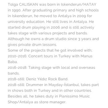 Konyaaltı/Toros’daki ev stüdyomda, karşılıklı iki akustik davul ile ders vermekteyim. Öğrencilerin isteklerine göre seçtiğim iki çeşit müfredatım var. Biri en temelden davul notası ile akademik müfredat. Diğeri ise hobi amaçlı davul çalmak isteyenler için çok sıkmadan, bilindik şarkılar üzerinden giden müfredat.