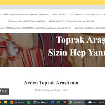 Merhaba sayın ilgili, Pazar ve kamuoyu araştırma şirketi - Toprak Araştırma ve Danışmanlık https://www.toprakarastirma.com/ olarak 4. yılımızda sizlerle araştırmalarınız için iş birliği içinde olmayı dileriz. Hizmetimiz, diğer şirketlere göre daha düşük fiyatlıdır. Uygun bir pazar araştırma şirketi olmamız müşterilerimizi bize çeken ana DES/AB/633 Etkiniz AB programı kapsamında anket ve raporlama hizmeti -2022- Tübitak projesi, teknik danışmanlık ayrıca siyasi partiler için anket yapılması, analiz ve raporlama hizmeti gibi pek çok hizmet vermekteyiz.