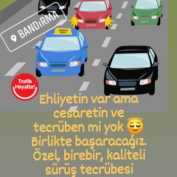 Haydihanımlardiresiyona M.E.B . onaylı sertifikalı eğitmenden Kaliteli sürüş teknikleri ve guvenilir eğitim. Ehliyeti olan hanımlara kendi araçlarıyla uygun fiyatlı direksiyon dersi verilir. Sende aktif şehir trafiğinde aracını kendin kullan. Seyahat etmek için kimseye ihtiyacın olmasın. Haydi Bandırma haydi hanımlar. Birlikte başarıyoruz