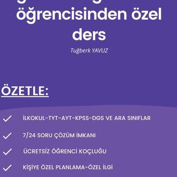 Her seviyeye uygun matematik özel ders ve eşliğinde her öğrencime sistematik şekilde Öğrenci Koçluğu veriyorum. 📌İlk dersimizi tanışma dersi olarak yapıyorum. Bu dersimizde öğrencimiz ve ailesiyle tanışıyor, öğrencimize mini bir seviye tespit sınavı uyguluyorum. Daha sonra seviyesine göre plan, programlama yapıp derslerimize başlıyoruz. 📌Öğrenci eğer grup dersi almak istiyorsa muhakkak ki grubundaki diğer öğrenciler ile seviyesinin yakın olması gerekiyor. Bilgi seviyesi arasında büyük uçurumlar olan öğrencilerle kesinlikle grup ders yapmıyoruz. 📌Bu seviye tespitinden sonra aileyle tekrar iletişime geçip öğrencinin haftada kaç ders alacağına, dersin hangi gün ve saatte olabileceğine karar veriyoruz. 📌Derste öğrencime not tuturmuyorum. Bu sayede çok daha fazla soru çözüyoruz 📌Dersleri kendim hazırladığım notlar üzerinden veya kitaptan işliyoruz. Eğer notlarımdan yapacaksak gelmeden önce notumu fotokopi olarak alıyorum ve dersten sonra öğrencime veriyorum. 📌Dersimizden sonraki ilk 48 saat içerisinde öğrencimden notlarımızı kesinlikle tekrar etmesini, çözdüğümüz soruları tekrar kendi defterine çözmesini istiyorum. 📌Her dersten sonra aileye Özel Ders Raporu veriyorum. Bu raporda "Öğrencinin Ödevlerini Yapıp Yapmadığı, , Derse İlgisinin ve Katılımının Nasıl Olduğu gibi bilgiler ve O Haftaki Ödevleri" gibi konulardan bahsediyorum. Bu noktada aile ile periyodik şekilde bilgi alışverişi yapıyoruz. 📌Bir sonraki hafta derslerimizden geri kalmayacak şekilde o haftaki ödevde yapılamayan soruları birlikte çözüyoruz ve bu sayede bilmediklerini öğrenip eksiklerini tamamlıyoruz. 📌Yüz yüze derslerde ücretler: Birebir ders ücreti 75 tl 2 kişilik grup ders ücreti 100 tl 3 kişilik grup ders ücreti 120 tl şeklindedir
